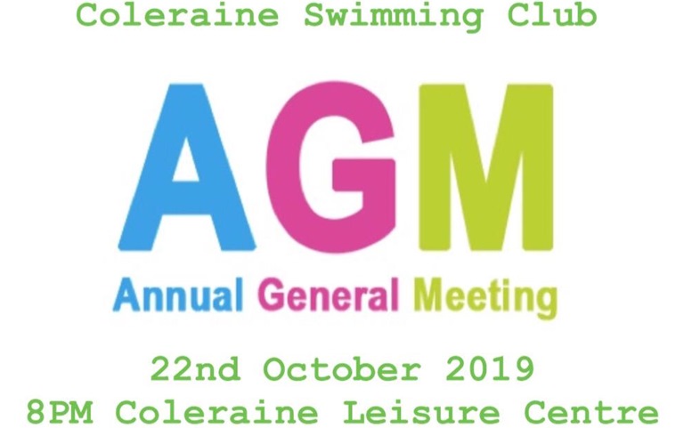 On Tuesday 22nd October 2019 at 8pm Coleraine Swimming Club will have its AGM in the Committeee Room at the Coleraine Leisure Centre.