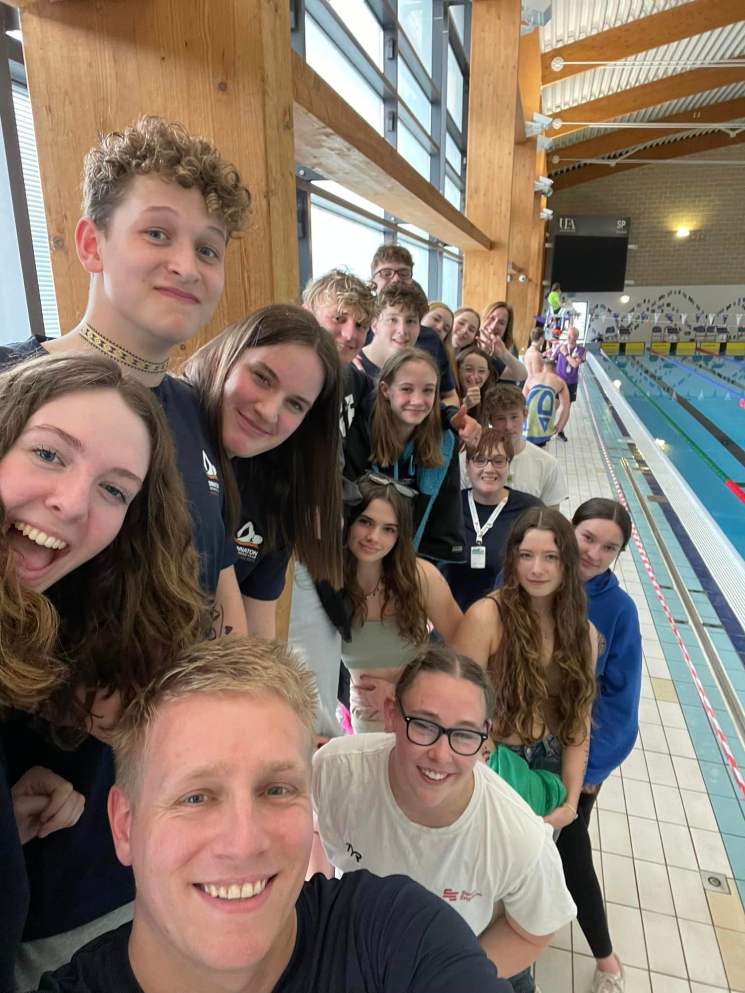 The journey - six hours on a good day - went well, most of us avoided the bad weather, and we met at the UEA Sportspark for a swim to loosen off the journey. We discovered another familiar face, Reid Jones, who started his swimming with Dinnaton until 2016 and now swims with Bath University, was also entered into the meet.