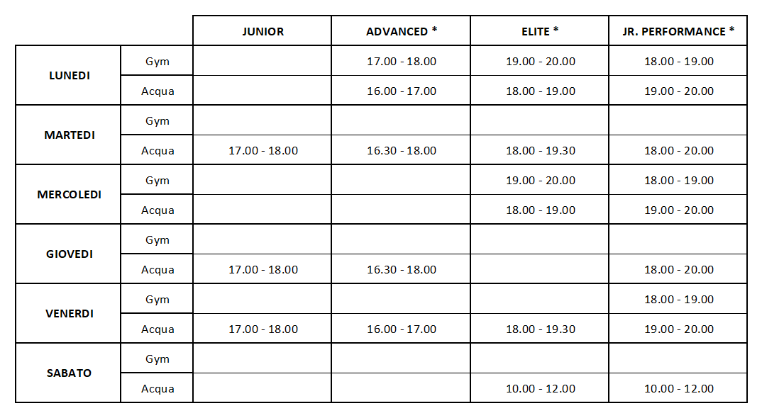* Le modalità dei corsi contrassegnati verranno definite al raggiungimento del numero minimo di atleti per formare il gruppo
