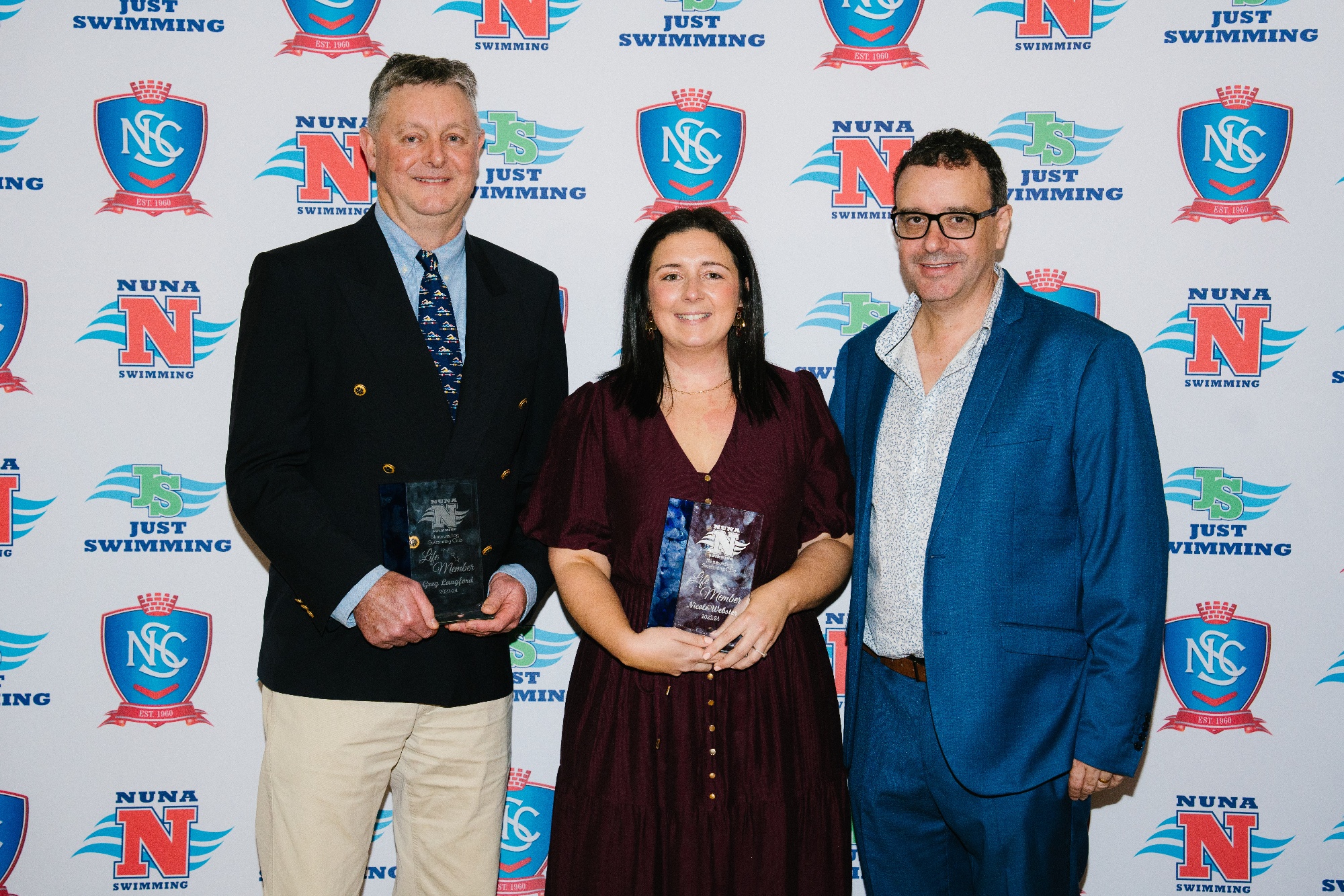Greg Langford (left) and Nicole Webster (middle) being awarded Life Membership by President Matthew Muir in 2024