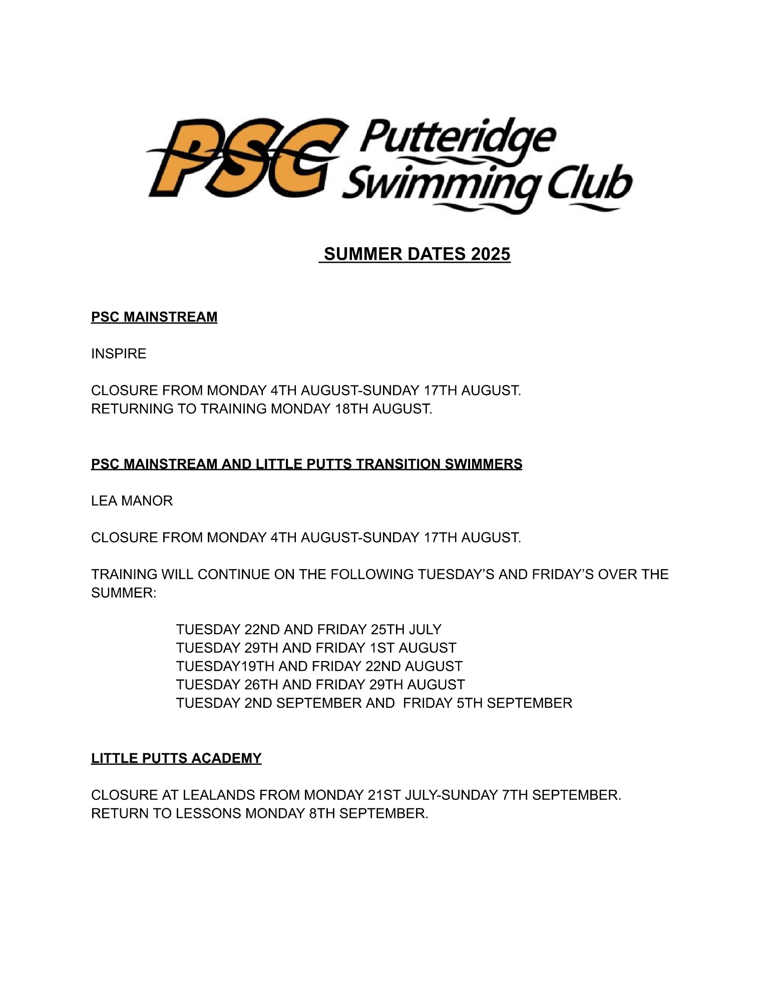 2025 Summer Break dates for PSC & Mainstream Swimmers.