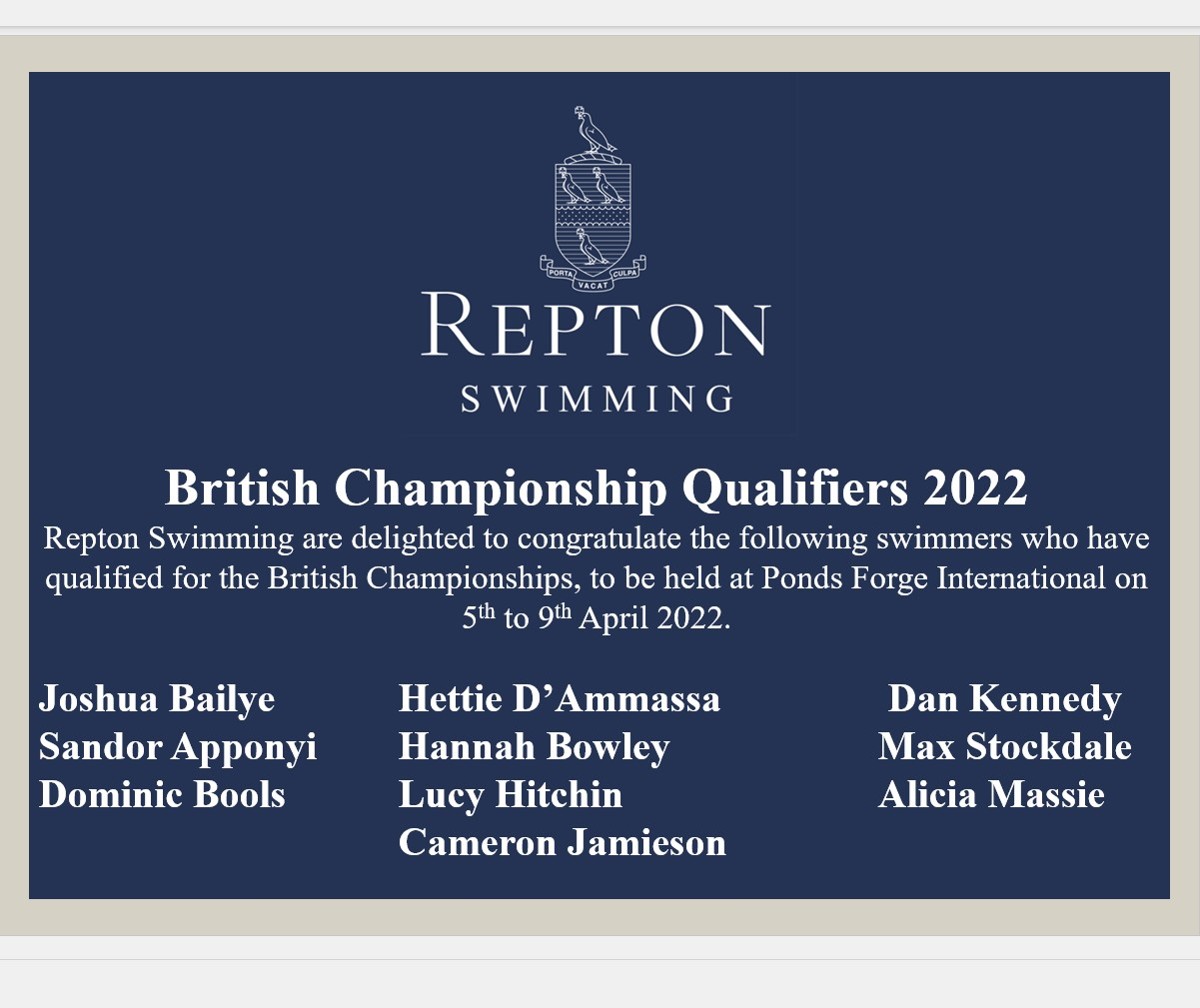 Repton Swimming are delighted to congratulate the following swimmers who have qualified for the British Championships, to be held at Ponds Forge International on 5th to 10th April 2022: