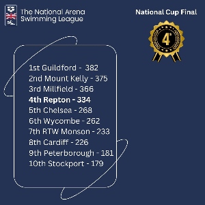Following being crowned as champions of the West Midlands Region in December, Repton Swimming were part of the National Arena League Cup Final in Cardiff on Sunday 3rd March. The Final encompassed the top ten clubs in the UK, including the winners and best runners up from Swim England's seven regions. With a number of previous winners of the Cup Final in attendance, competition was fierce. This was Repton's debut appearance in the Finals. Having only been formed in 2019 and having first competed in the competition in October 2021...
