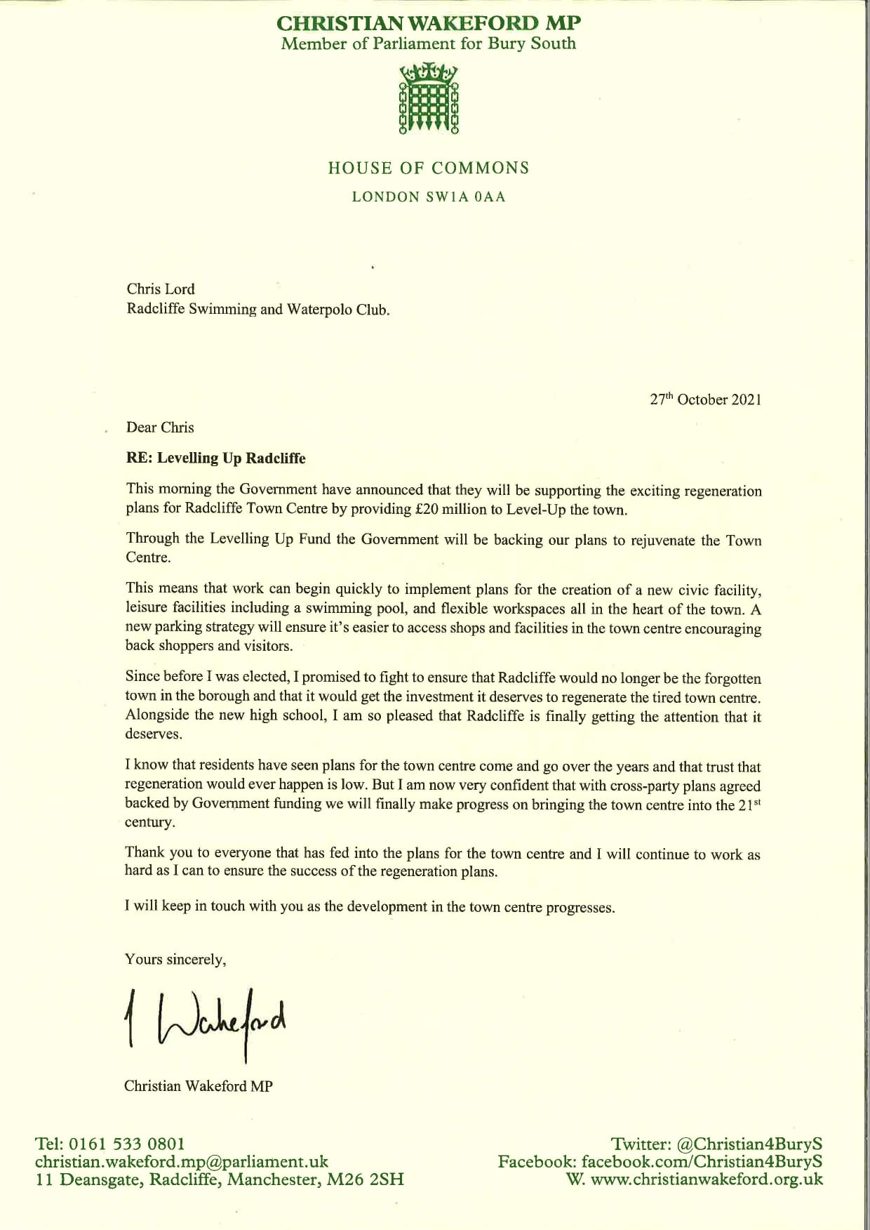 Please find the attached letter from Christian Wakeford MP which outlines his support for the new pool in Radcliffe and the £20 million that has been granted by the Government for the Levelling Up Fund to support the proposals to regenerate Radcliffe Town Centre which includes a new leisure facility and pool.