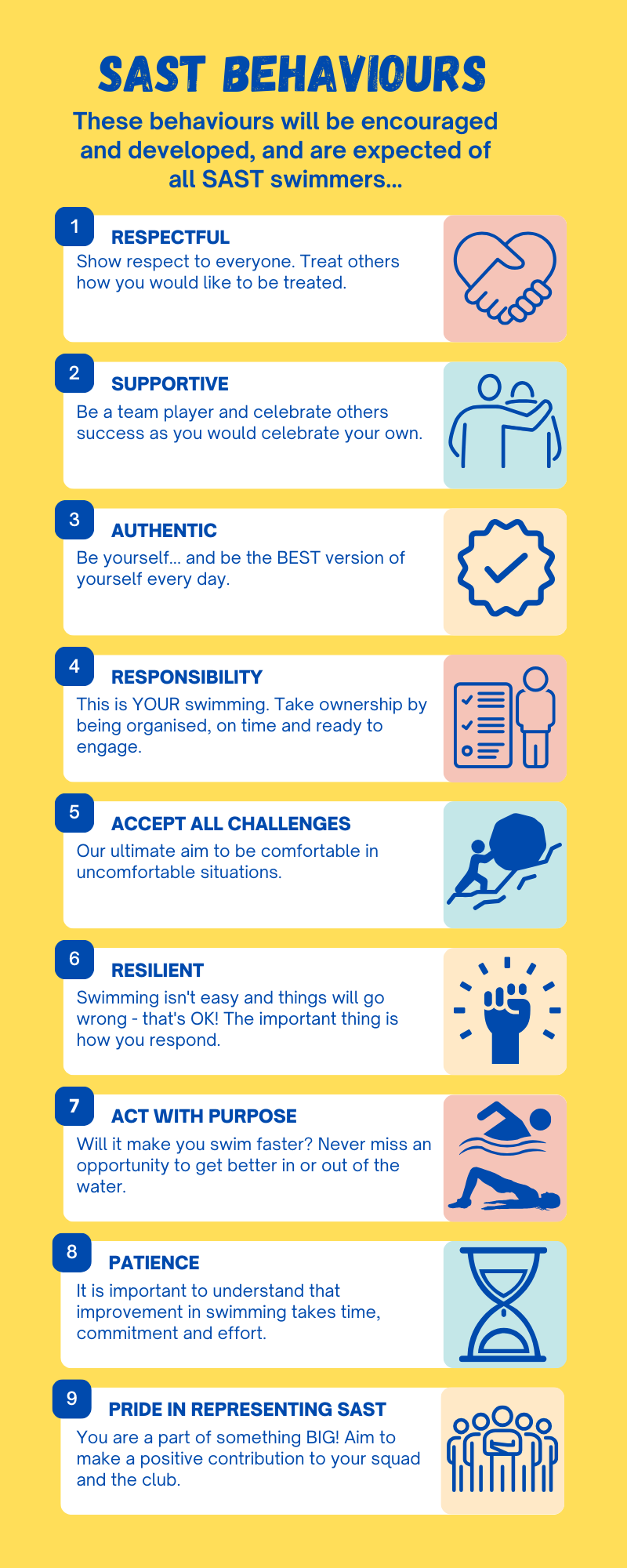 We have created a set of behaviours which we will be looking to reinforce across the club over the rest of the season and beyond. The coaches will be taking a lead on this but it applies to all members of the club - swimmers, parents/guardians and coaches alike.