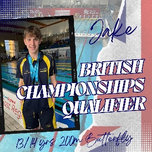 Huge Congratulations to Jake, he has qualified for British Championships & English National Championships. After a fabulous swim to win the 200m Butterfly at the East Region Championships, Jake's time was one of the fastest 28 swimmers in Britain in the 13-14 years age band and one of only three 13 year olds. He has qualified for 200 Butterfly for the British Championships. Jake will be swimming in the English National Championships in the 12/13 years. He has qualified for the following events at the English National Championships: 100m Butterfly...