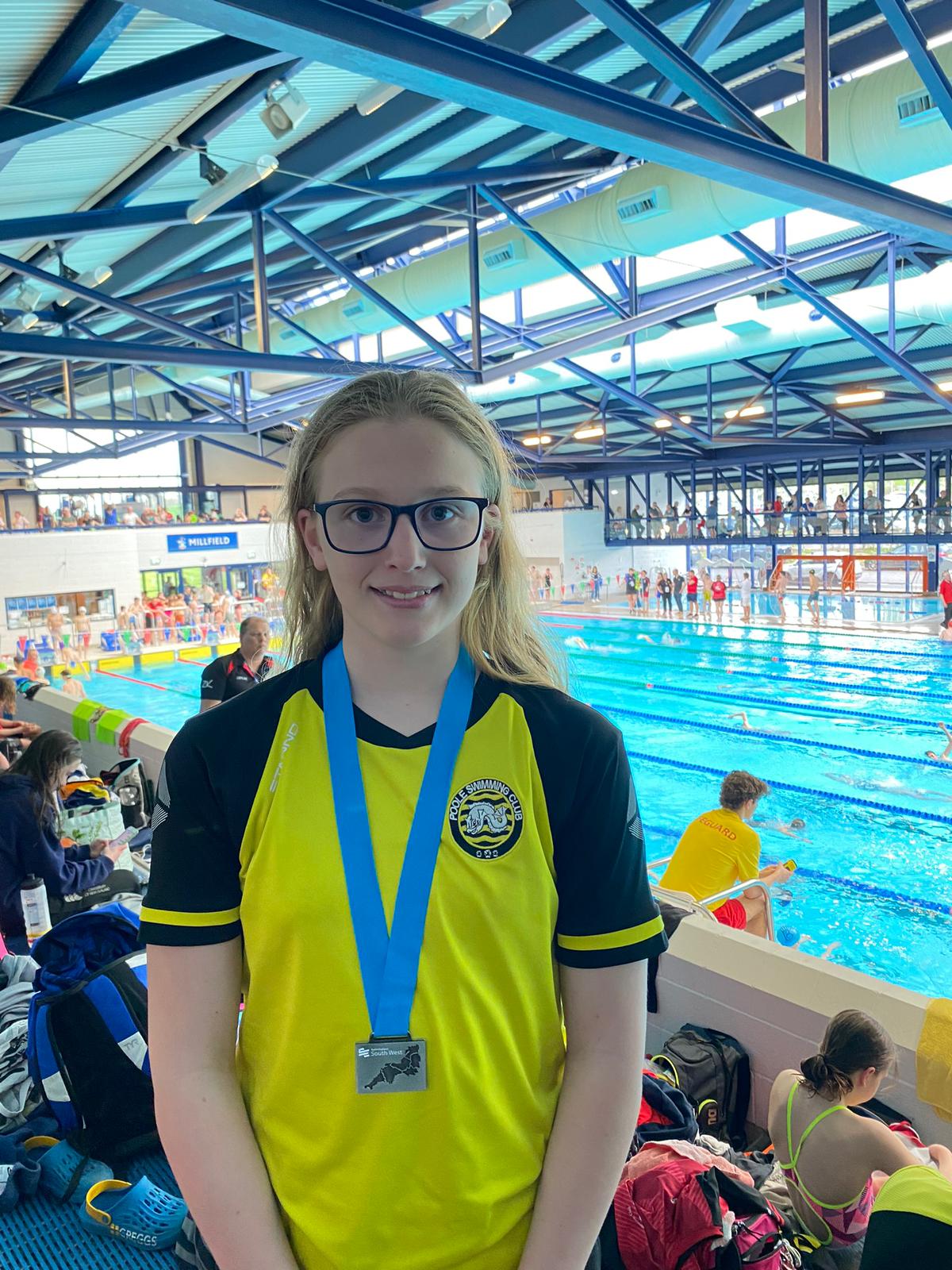 Up first came Poppy and Daria in the 11/12 years 200m Backstroke. Both girls swam a great race with Poppy just touching ahead of Daria to take the bronze medal and Daria coming 4th. This was a great race to watch. Macie placed 5th in the 13 years age group in this event and Erin placed 6th in the 14 years age group improving on her heat time.