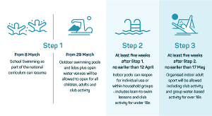 As you will be aware the Government have set our route out of lockdown. The image shows the steps with which we can hopefully return to the pool. We hope to be able to start some senior squads back in the water on the 4th, 10th & 11th April. We are really hoping that the 12 April remains the date that indoor pools reopen and we are confident we will be able to get all squads into the water from this date. As the pools are all operating a phased...