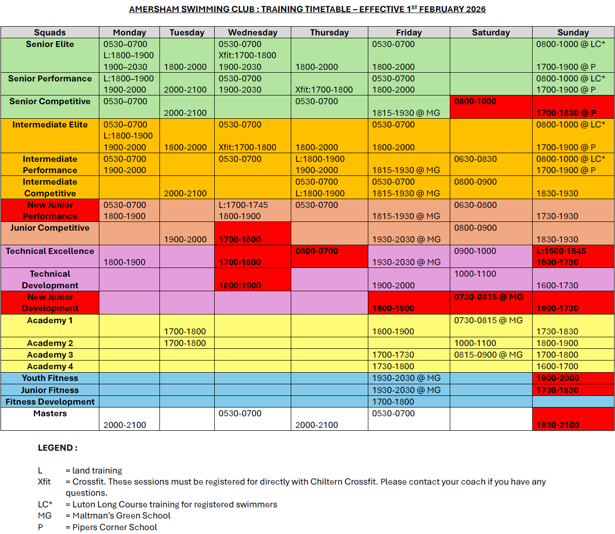 Please ensure that you look at the new timetable as there have been some minor changes to the timings of some squads.